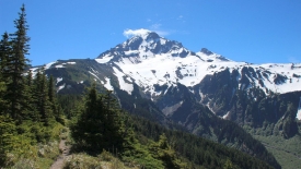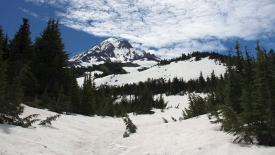 Le sentier part tout doucement vers l’est. Dès les premiers mètres, le Mount Hood est là.