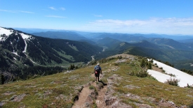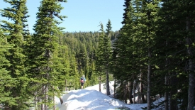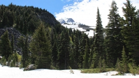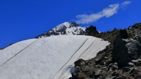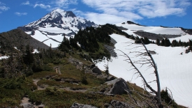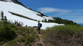 Nous passons une jonction de sentiers, abandonnant le Pacific Crest Trail et poursuivons sur le Timberline Trail. Le Timberline Trail est l’équivalent du Loowit Trail du Mount St Helens : c’est un sentier de quelques 40 miles qui fait le tour du Mount Hood.