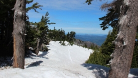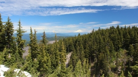 Une première trouée dans les arbres nous laisse apercevoir le Mount Hood… Nous pouvons également nous rendre compte que nous ne sortirons pas de la forêt avant un moment !