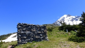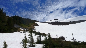 Nous sommes ici au McNeil Point Shelter, un refuge sommaire qui défie les saisons. Au fond, le Mount Hood.