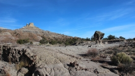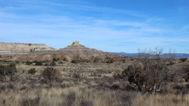 Au loin, une butte surmontée d’un bloc rocheux : the Angel of Ceja Penistaja. Nous marchons dans cette direction. Je reparlerai un peu plus loin de la mesa qui se trouve derrière (sur la gauche) du bloc rocheux.