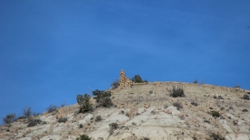 Comme promis, un petit encart sur la mesa parallèle à Angel of Mesa Penistaja. Ses extrémités sont ornées de deux constructions de 8 pieds de haut sur une base de 4 pieds de large. En réalité, il y en a trois mais nous n’en voyons que deux. Ces constructions ne sont documentées nulle part et quoique utilisant les mêmes techniques que les constructions pré-colombiennes, personne n’est certain qu’elles aient été construites à cette époque ou, plus tard, par des bergers pour les aider à se repérer.