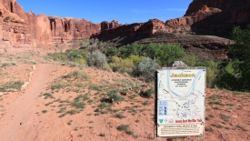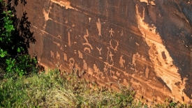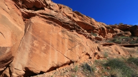 Nous repartons en direction de Moab. Les bords du Kane Creek Blvd abritent quelques panneaux, dont certains bien abîmés par des cons, à cause de leur facilité d’accès.