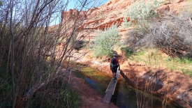 Nous traversons le Kane Creek sur un petit pont, enfin une planche en bois de 40 cm de largeur. C’est toujours mieux que de devoir chercher un passage par des cailloux ou pire devoir se mouiller les pieds.
