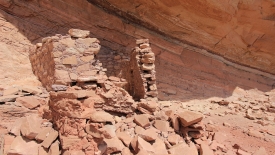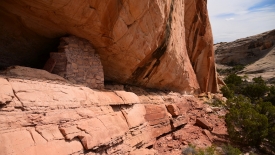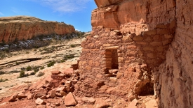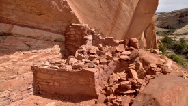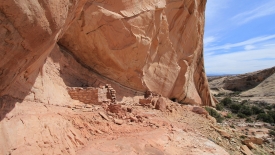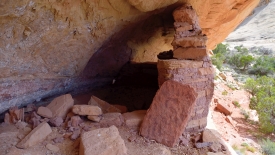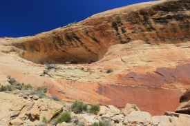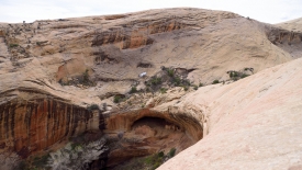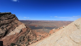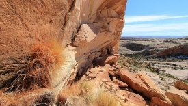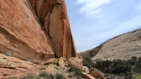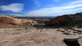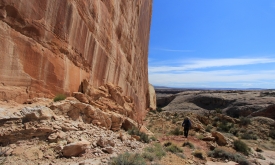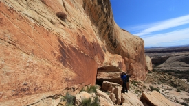 Nous suivons la face sud du canyon, en descendant vers le Butler Wash. En contrebas de l’alcôve, légèrement en décalé, la paroi de la falaise est bien plate.