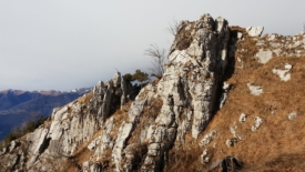 Stefano scrute le ciel qui n’a pas vraiment l’air de vouloir s’ouvrir. Le vent est toujours furieux mais la pluie est éparse. Stefano me propose deux alternatives : prendre un sentier qui revient vers Brè et, en cas d’amélioration, remonter au Monte Boglia ou partir en direction des Denti della Vecchia. Je choisis la seconde.