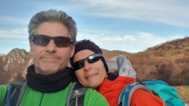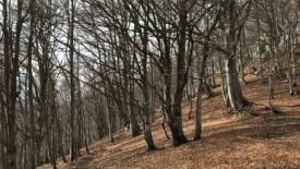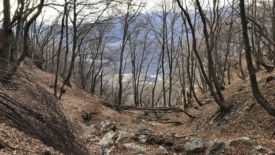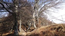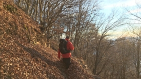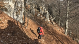 À certains endroits, le vent a accumulé les feuilles sur le sentier et nous évoluons dans 30 à 40 cm de feuilles. Nous en avons jusqu’aux genoux. Au début, je trouve ça plutôt sympa jusqu’à ce que, à un passage en dévers avec une forte pente, les feuilles se mettent à glisser de concert sous mes pieds. J’ai l’impression d’être dans de la neige poudreuse. Je n’ai plus de prise. Je mets les mains par réflexe mais elles s’enfoncent jusqu’au coude. J’arrête de bouger. J’ai un moment de panique. Je regarde Stefano, un peu désemparée. Stefano, c’est mon héros. Tel Zorro, il revient sur ses pas, me prend la main et me guide sur le sol ferme.