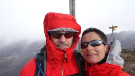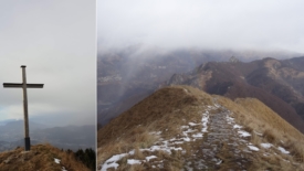 Arrivés en haut, nous ne traînons vraiment pas. L’heure n’est pas au tourisme. Une photo de croix et un autoportrait plus tard, nous filons en direction des Denti della Vecchia. Pour y aller, nous n’avons qu’une option : ce sentier glacé, qui suit la crête. Les conditions sont vraiment extrêmes. Bon ça pourrait être pire : il pourrait neiger et ainsi réduire notre visibilité. Tout compte fait, nous avons de la chance…