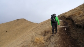 Quelques mètres à peine après avoir pris cette photo, il se met à pleuvoir. Nous ne sommes plus à l’abri dans la forêt et le vent, que nous entendions souffler dans la vallée, vient nous caresser. Ce sont d’ailleurs plus des claques que des caresses. Certaines rafales nous font vaciller. Nous enfilons nos Gore-Tex et pour moi les gants. Les chapeaux de pluie resteront dans le sac car il n’y a aucune chance qu’ils restent plus de 5 secondes posés voire même ancrés sur nos têtes. La crête est étroite mais heureusement, de chaque côté, il y a une pente herbeuse. Si nous tombons, déséquilibrés par une rafale, ce ne sera pas bien méchant. Par moment, nous sommes obligés de nous arrêter, afin de laisser passer des bourrasques plus furieuses que les autres.