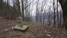 J’ai quelques minutes pour chauffer le moteur sur un sentier parfaitement pavé. Sans tarder, nous nous dirigeons vers le pied du Monte Boglia d’où le sentier semble y monter tout droit. Sur cette photo, les perspectives sont écrasées. Le rocher qui émerge, à gauche, s’appelle le Sasso Rosso et est beaucoup plus bas (1’294 mètres) que le sommet du Monte Boglia que l’on voit, dégarni, au centre de la photo (1’516 mètres).