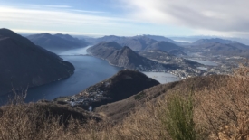 Au centre, en contrebas, l’église de Brè. La voiture est par là autour. Au fond le lac de Lugano, au premier plan, à droite, le Monte Brè et enfin au second plan, plus au centre, le Monte San Salvatore. Sans aucun doute, un œil averti devinera Vignino, quelque part, entre le sommet du Monte Brè et celui du Monte San Salvatore.