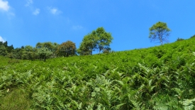 Nous sortons un bref instant de la forêt pour traverser un champ de fougères. Le vert tendre et lumineux des fougères offre un magnifique contraste avec le bleu du ciel.