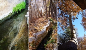 L’eau qui s’échappe du puits ressurgit (1) d’un trou dans la roche. Un canal d’irrigation, construit initialement par les Sinagua et consolidé et restauré par les colons, canalise cette eau pour l’emmener vers les surfaces jadis cultivées (2). Un énorme platane, dont une section du tronc est presque horizontale, domine le creek (3).