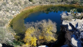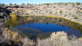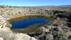 Montezuma Well est une merveille géologique. C’est un sinkhole. Le terme français équivalent – gouffre – ne traduit pas le fait que ce gouffre est le résultat de l’effondrement d’une caverne. Il faut souligner que ce gouffre, d’une profondeur d’environ 16 mètres, est en réalité un puits artésien, ou plus précisément un puits sous-artésien (subartésien), puisque l’eau n’est pas jaillissante. Plus de 5’600 m3 d’eau alimentent quotidiennement le puits, et ce depuis plusieurs milliers d’années. Il y a donc évidement qu’un volume d’eau équivalent qui s’évacue d’une manière ou d’une autre.