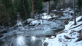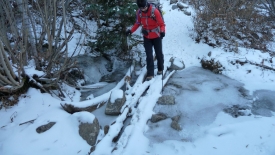 Nous traversons un torrent sur des troncs recouverts de glace. La surface de l’eau est gelée et pourtant l’eau est vive.