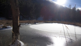 Tels des gamins, nous jetons des pierres sur la glace recouvrant un petit étang, histoire d’en apprécier l’épaisseur.