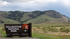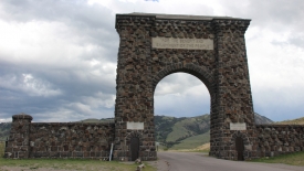 La porte originale du parc, Roosevelt Arch, dont la première pierre a été posée par le President Theodore Roosevelt en 1903, et la citation For the enjoyment and the benefit of the people (« Pour le bénéfice et la jouissance du peuple »), tirée de la loi qui a créé le parc de Yellowstone en 1872.