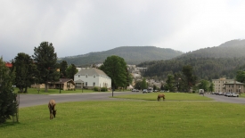 Un troupeau de biches semblent apprécier la pelouse amoureusement entretenue de Mammoth.