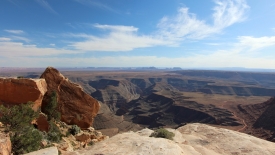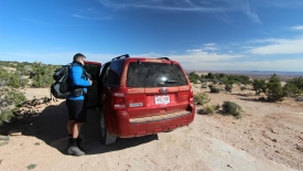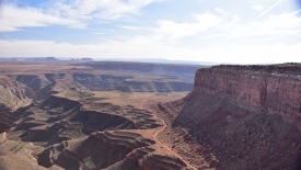 Pour nous rendre à Muley Point, nous empruntons la UT-261 et filons à son extrémité sud. La partie goudronnée se termine au bord de la falaise et ensuite une piste sinueuse emmène le touriste et le marchand dans la plaine via le Moki Dugway. C’est aussi un point de notre bucket list, point ajouté en 2011, lors de nos trois semaine des vacances, ces fameuses trois semaines qui nous ont donné goût aux longues vacances. On connaît la suite, car en 2012, nous avons pris 4 mois de vacances…
