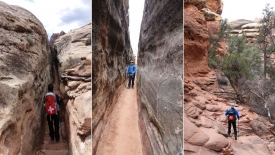 La descente suivante se fait à l’étroit (1) (2) … et la remontée sur du slick rock, dans le lit d’un wash (3).