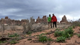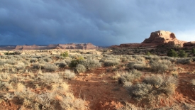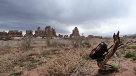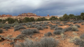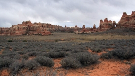 Au loin, les aiguilles de Chesler Park et les nuages noirs qui deviennent menaçants.