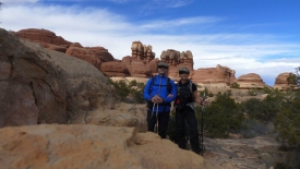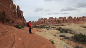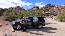Nous sommes prêts à démarrer le moteur alors qu’une voiture de rangers arrive. En sort un ranger qui vient vers nous. Automatiquement nous vient à l’esprit la question : mince, qu’avons-nous fait ? Mais non, c’est un contrôle de routine. Nous engageons la conversation alors que le second ranger rejoint notre groupe. Nous restons ainsi une bonne demi-heure à discuter des sentiers, de ce qu’il faut voir. Pour la première fois, nous entendons un ranger dire : n’hésitez pas à sortir des sentiers, explorez ! Nous parlons du Maze, cette section du parc très difficilement accessible. Eux, nous donnent un tuyau : louer un canoë à Moab, descendre le Colorado sur plusieurs jours, s’arrêter chaque jour à un endroit différent dont certains donnent accès au Maze. Pas besoin de guide, nous disent-ils. Il suffit de spécifier la date à laquelle une navette vient vous chercher au terme de la descente pour vous remonter à Moab. Nos yeux brillent déjà à l’idée de cette future aventure !