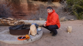 Stefano, très inquiet, surveille la cuisson de l’eau après avoir soigneusement placé une pierre pour protéger la flamme du vent ! Il ne s’agirait pas de louper cette étape cruciale !