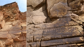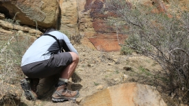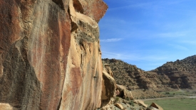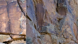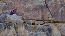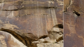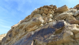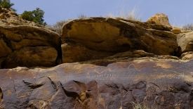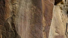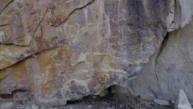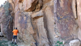 Nous garons la voiture à la bifurcation et empruntons la piste à pied histoire de prendre le temps d’étudier les roches qui bordent la route. Nous remontons le canyon sur environ 500 mètres avant de nous rendre à l’évidence. Il n’y a rien. En revenant sur nos pas, nous réalisons que les panneaux sont quasiment à la bifurcation, où un bloc de rochers offre des pans de falaise propice au pecking (piquetage).