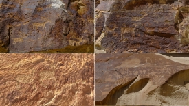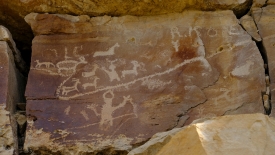 Ce panneau ne se contemple pas en quelques secondes. Nous restons devant, à admirer chaque détail, de longues minutes. D’abord, il y a les chèvres : leur corps rectangulaire, leurs cornes et leur 4 pattes bien droites, terminées par les sabots. Nous en dénombrons une vingtaine de grandes et une dizaine de petites. Les petites s’observent à partir de la seconde rangée et se trouvent systématiquement derrière un grande. Nous en déduisons que ce sont les petits. Ensuite les chasseurs. Nous en identifions avec certitude 4, tous sur la droite, et armés d’arc et prêts à tirer. Et enfin, sur la première rangée, au centre, cette forme humaine, qui, selon les experts, est une représentation humaine de l’époque Fremont.