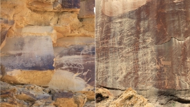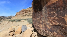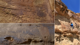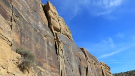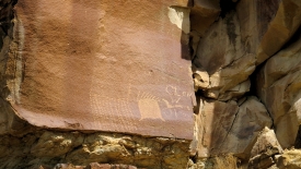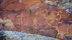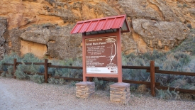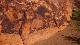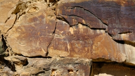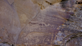 Les pétroglyphes de First Site sont encore à l’ombre. Il y a plusieurs panneaux, dont certains très abîmés, soit par l’humain soit simplement par le temps.