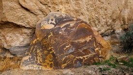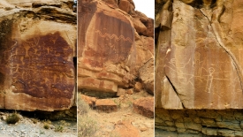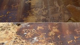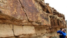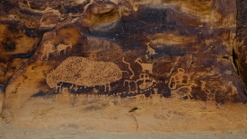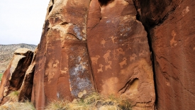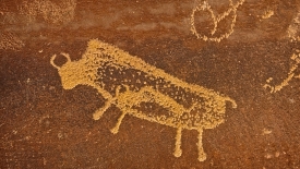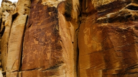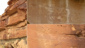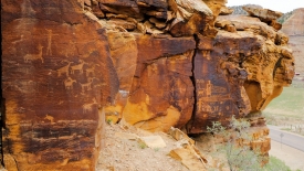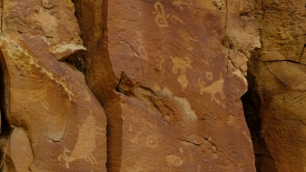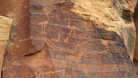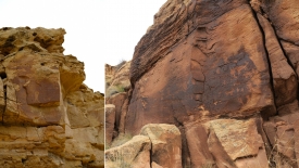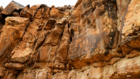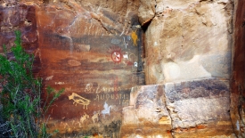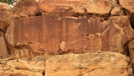 Nous marchons à nouveau sur quelques centaines de mètres et trouvons ce que nous cherchons. Un panneau comprenant des pétroglyphes et des pictogrammes de couleur blanche, rouge et jaune.