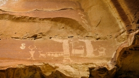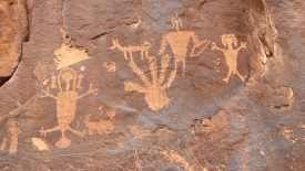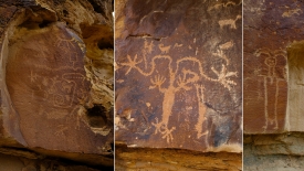 Les dessins sont peints en blanc et en rouge et il y a quelques pétroglyphes.