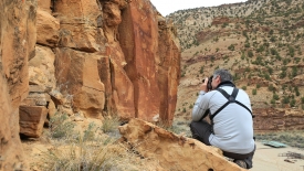 Le ciel est gris aujourd’hui et la température est un peu (j’ai dit un peu) plus douce qu’hier, mais il ne pleut pas, alors vive la vie. Après tout, pour photographier des pétroglyphes, il vaut mieux ne pas avoir de soleil car cela évite d’avoir des ombres intempestives.