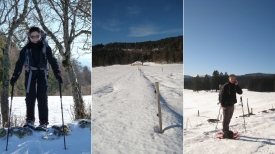 Chausser des raquettes, c’est tout simple, c’est comme des fixations de snowboard ! Le réglage de la hauteur des bâtons requiert un peu plus de concentration (1). Les premiers pas sont un peu hésitants (2) mais bientôt nous trouvons notre équilibre. Et c’est parti (3) !
