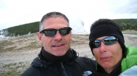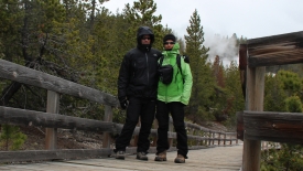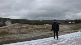 Stefano, en Keen, dans la neige, attendant que Old Faithful daigne rugir.