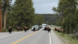 Un troupeau de bisons sur la route cause un bouchon.
