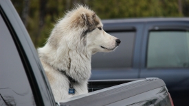 Un magnifique husky, très patient sur le plateau d’un pick-up.