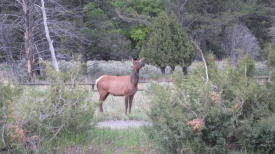 Nous partons ensuite faire quelques pas pour une promenade digestive. C’est alors que nous entendons des gens crier : Bear ! Bear ! Effectivement, à moins de 100 mètres, sur la pente d’une colline, il y a un ours brun et une biche qui semblent jouer ensemble. Ils s’observent, la biche fait mine de charger l’ours qui recule alors de quelques pas… Nous ne les voyons que sporadiquement, à cause des arbres. Puis, la biche descend au galop sur la route, à quelques mètres de nous.