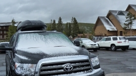 Nous nous réveillons … sous la neige ! Nous n’osons pas sortir du lit tellement la chambre s’est refroidie durant la nuit. Dehors, nous voyons des gamins en tee-shirt, short et tongues se battre à coup de boules de neige. C’est sûr… Être élevé avec la climatisation à 16° C, rend les américains beaucoup moins chicken (poule mouillée) que nous.