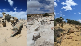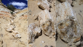 Comme hier, nous trouvons, , des pierres en forme de tronc. Nous les observons mais ne trouvons pas l’once d’une structure fibreuse ou ligneuse. À l’inverse de tous les troncs pétrifiés que nous avons vus jusque là.