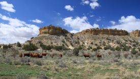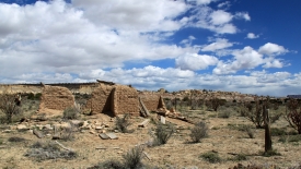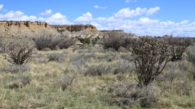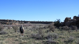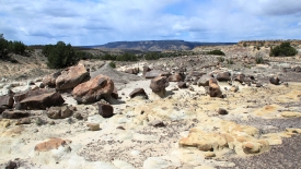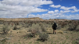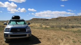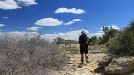 Stefano sait maintenant que les formations rocheuses intéressantes à Ojito Wilderness se situent à une quinzaine de kilomètres de la route. Cette fois, nous nous enfonçons un peu plus et garons la voiture… au milieu de nulle part.