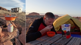 Nous faisons bouillir de l’eau dans ma toute dernière acquisition : ma casserole magique Sea to Summit ultra légère, pliable, en plastique, à part le fond en alu. Au menu du jour : Santa Fe Rice with Chicken et pomme au dessert, coupée avec mon Opinel made in Chambéry, Savoie et acheté chez REI. J’en avais marre de porter mes 227 grammes de couteau suisse. 43 grammes contre 227…