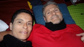 Le ciel s’est partiellement dégagé et le soleil nous éclaire, même s’il est passé 18 heures. Nous montons la tente en t-shirt, euphoriques. Même Stefano s’y met. Are you an effective team? Yes, we are.