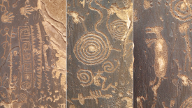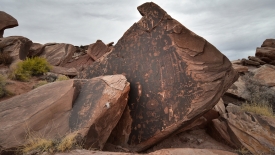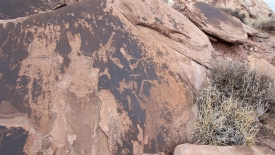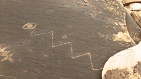 Ils ont été également abîmés par la main humaine. Par exemple, cet oeil n’est pas d’origine. D’abord il n’est pas gravé mais dessiné et ensuite ce symbole ne se trouve pas dans le répertoire habituel des Anasazis. Visibles aussi, des restes de lettres.