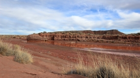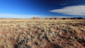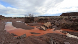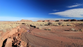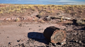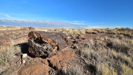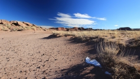 Nous retraversons le Lithodendron Creek. Au loin, le rim sur lequel est posé le Painted Desert Inn, est visible.