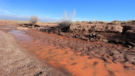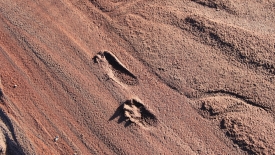 Il a plu cette nuit et sans doute ces derniers jours. Au départ du sentier, le sable était gelé. Maintenant que le soleil l’a réchauffé, il est meuble et colle avec enthousiasme à la semelle des chaussures. Nous sommes parvenus à éviter (certaines fois de justesse) les quick sands (sables mouvants) qui enrobent la chaussure sitôt le pied posé dessus.