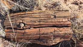 Un tronc solitaire gît au milieu de l’herbe. Amis lecteurs, préparez-vous psychologiquement à contempler des troncs. Qu’ils soient colorés ou ternes, ils méritent notre respect. Ils étaient vivants il y a 210 millions d’années.