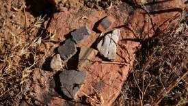 En redescendant, nous tombons sur le midden. Quelques pierres exposent des bouts de poterie, que nous les enfouirons ensuite un à un, avec précaution.
