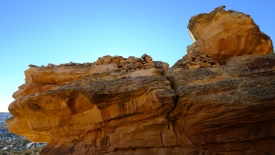 Nous observons avec attention des trous circulaires, creusés dans la paroi rocheuse, plus ou moins à la même hauteur. Ils nous donnent un bel indice de ce à quoi pouvait ressembler la ou constructions ici. Ils servaient à soutenir des troncs d’arbre (ou des grosses branches) constituant un plancher. Les murs que l’on voit montaient donc beaucoup plus haut et peut-être même rejoignaient-ils le surplomb. Il fallait également un autre mur, sur lequel devaient s’appuyer l’autre extrémité des troncs. Ce dernier, faisant face au canyon, devait très certainement être percé d’ouvertures, peut-être des portes en forme de « T ».