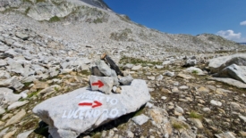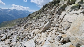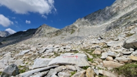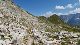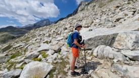 Nous marchons maintenant sur un pierrier. Les rochers sont stables et leur surface bien rugueuse. Même en chaussures basses, la marche reste aisée, à condition bien sûr de bien évaluer chaque endroit où poser le pied.